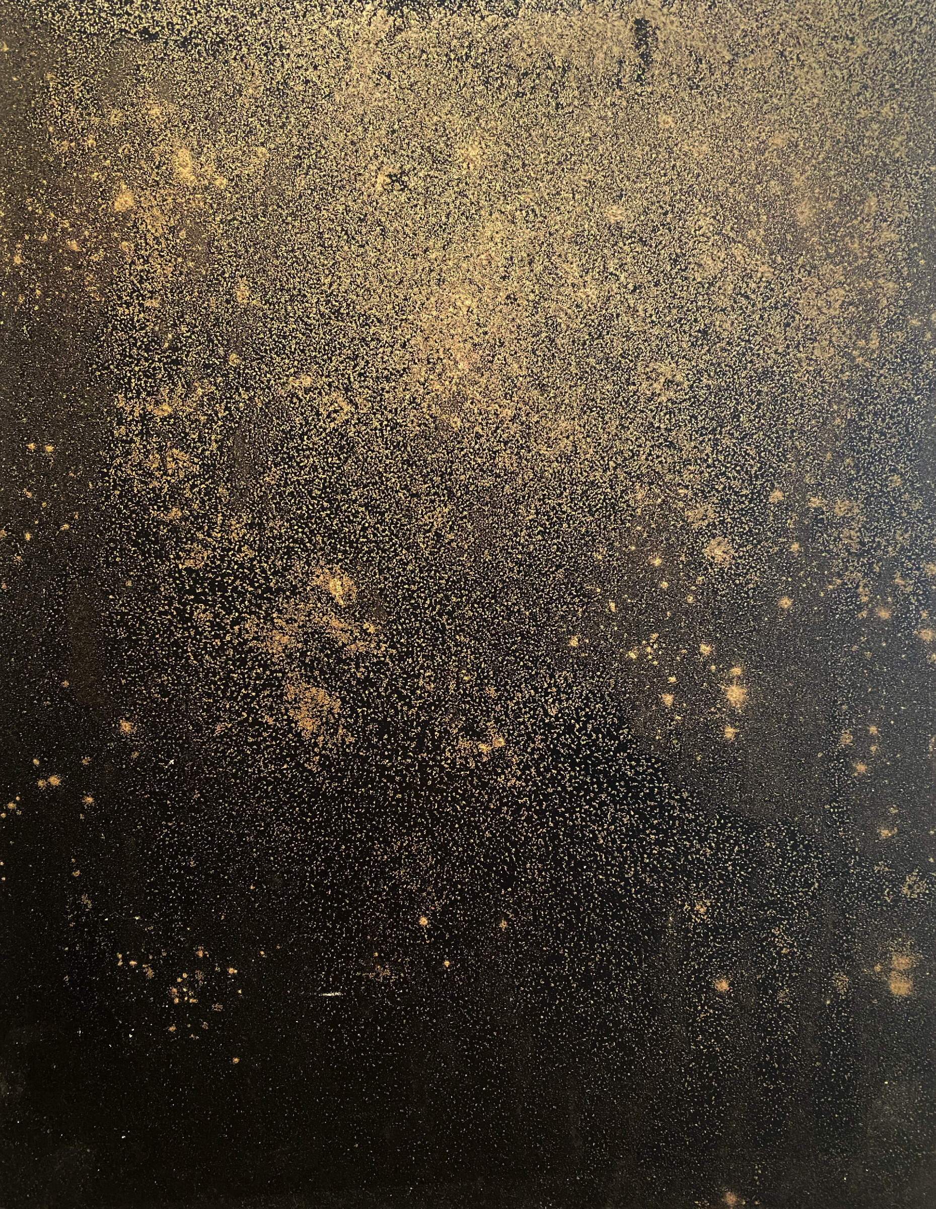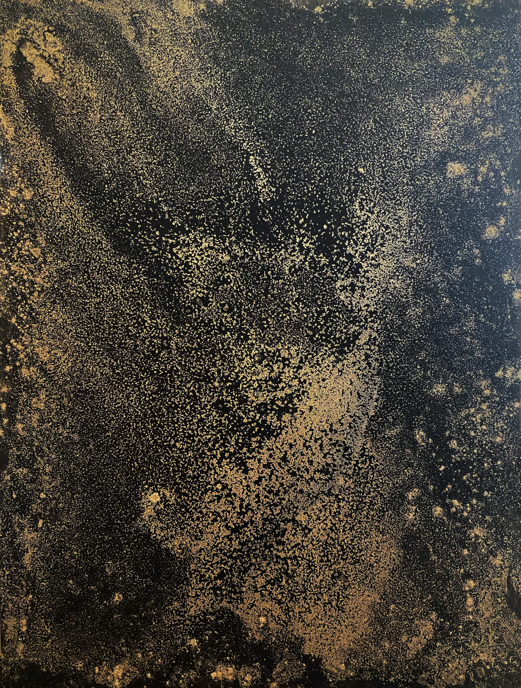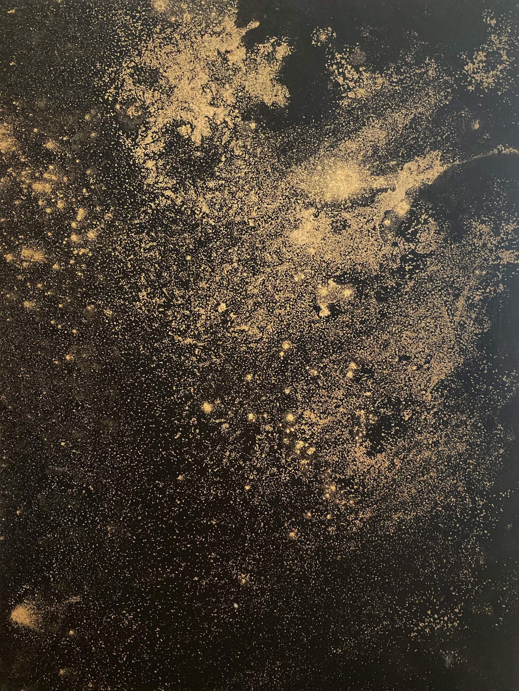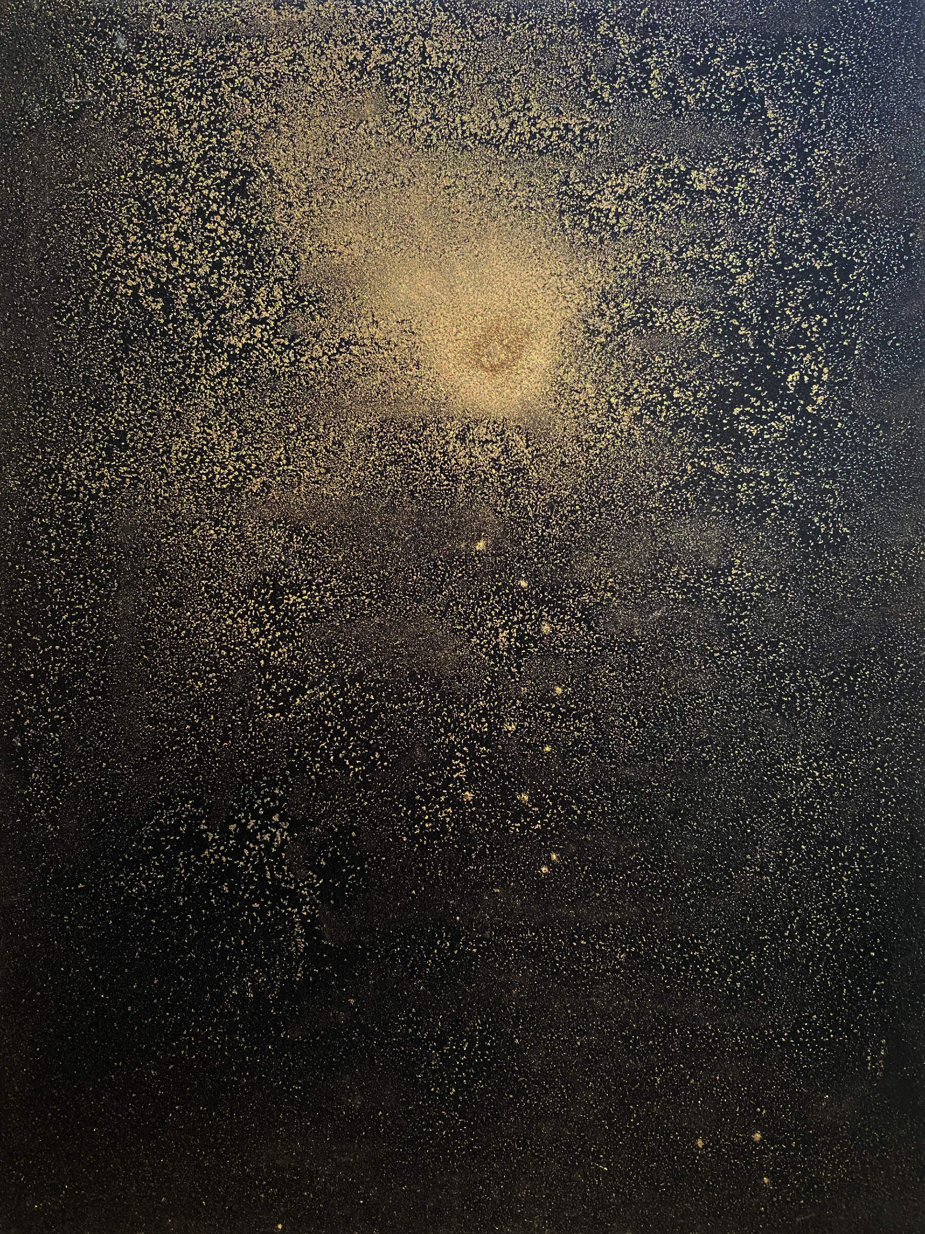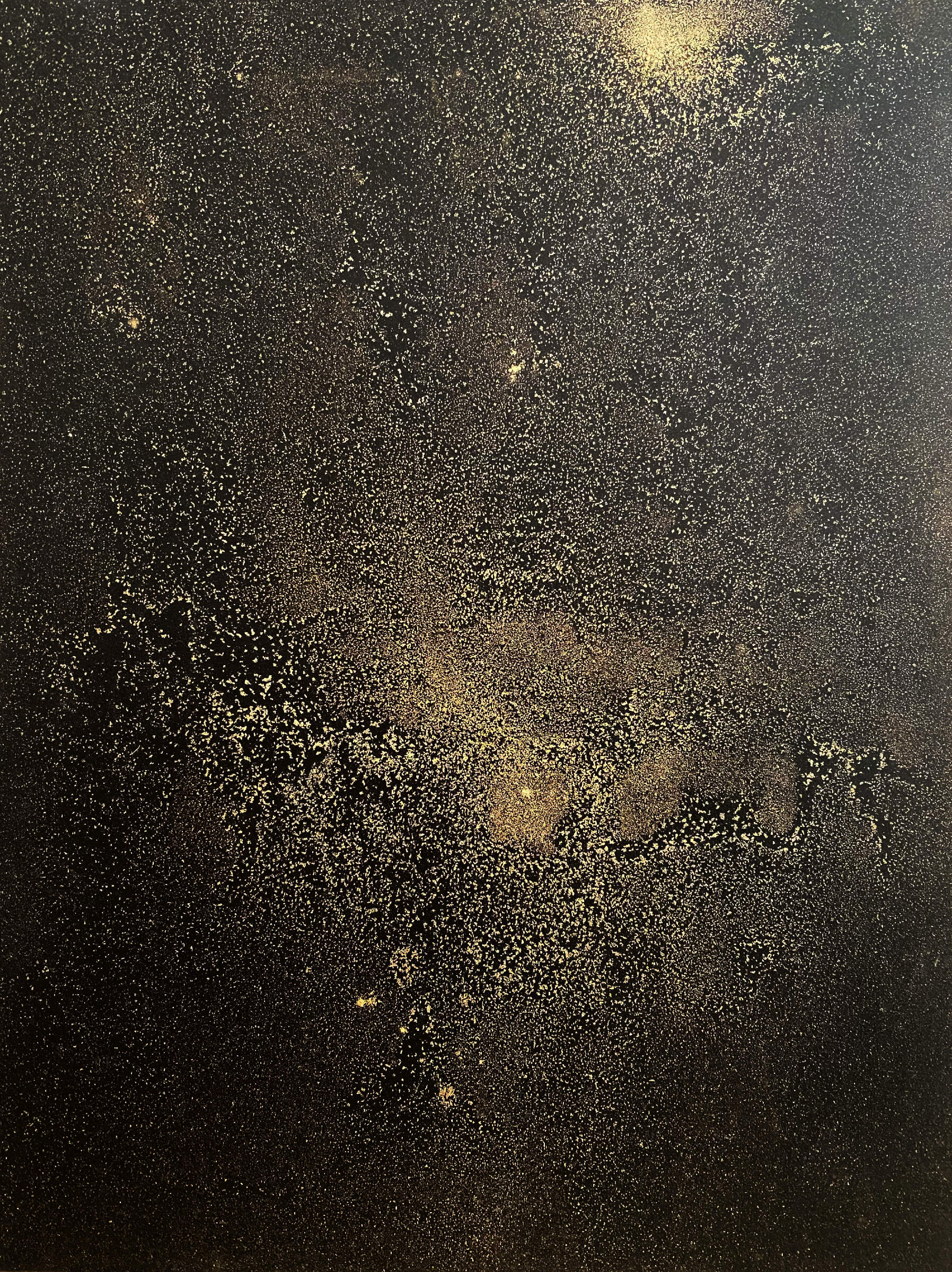 Dry metallic pigments suspended in black India ink express a deep sense of space, the cosmos, constellations, and the world beyond in these mixed media pieces.